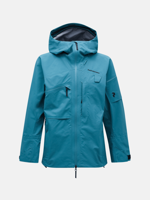 The jacket features an adjustable hood and is perfect to wear with a ski helmet. Fully taped seams, a snow skirt, and pit zips offer optimal protection and ventilation. Practical details like a radio pocket with antenna port, a RECCO® reflector, and multiple pockets complete the design.
